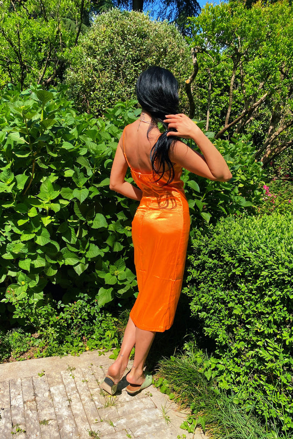 EN DESCRIPTION Satin effect Dress with square neckline, adjustable straps and lateral tear detail Accessories: logo tag, hand stitched on the back of the Dress Available Size: S - M - L Color: ORANGE INFO&DETAILS DETAILS Satin effect Fabric MADE MADE IN ITALY SIZE Model wears size S FIT...