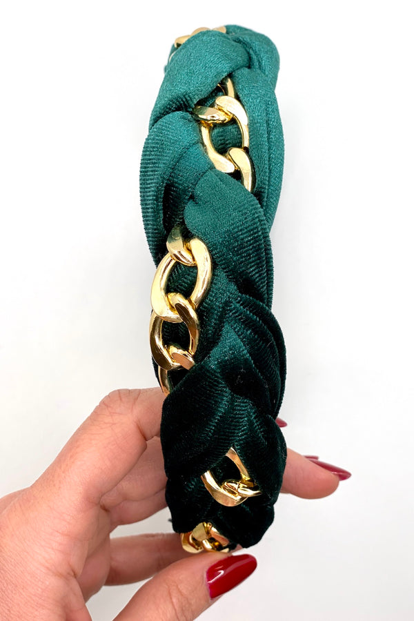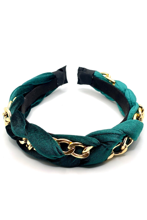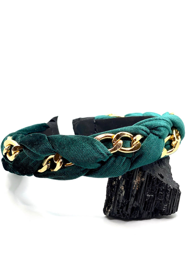 EN DESCRIPTION Imperial Baroque Velvet Headband with braid pattern and Golden Chain Handmade in Italy with Love Available Colors: BLACK - EMERALD GREEN - WINE RED - BLUE JEANS - LIGHT BROWN - CHAMPAGNE Size: ONE SIZE INFO&DETAILS COMPOSITION Velvet fabric LAVORAZIONE Made in Italy SIZE...