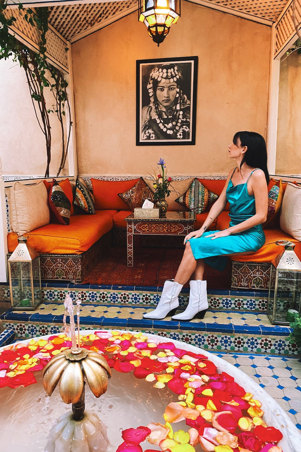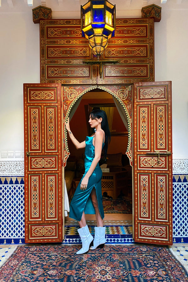 EN DESCRIPTION Satin Party Dress with square neckline, adjustable straps, side vent detail, and invisible zip closure on the back Accessories: logo tag, hand stitched on the back of the Dress Available Size: XS - S - M Color: BLUE - EMERALD INFO&DETAILS DETAILS Satin Fabric MADE MADE IN ITALY...