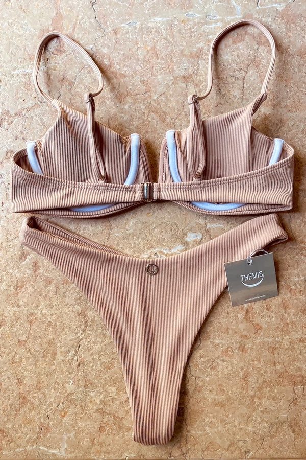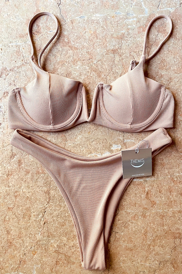 EN DESCRIPTION Double fabric Knit Bikini, Bra with removable padding, V neckline detail and light underwire and High Waist Brazilian Bottom Accessories: Logo Tag, hand stitched on the back of the Panty Available Size: S - M - L Color: SKY - SAND - RUST INFO&DETAILS COMPOSITION Knitwear LAVORAZIONE MADE IN ITALY SIZE Model wears size S...